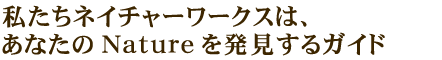 私たちネイチャーワークスは、あなたが自分の「Nature(本質)」を発見する旅のガイドを務めます。旅に出るのはあなたです。あなたの中に広がる無限の可能性の荒野に、美しく咲く花を見つけに行きましょう。